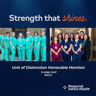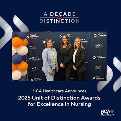 The hospital’s 3-Main medical/surgical unit and PACU (post-anesthesia care unit) received honorable mention during the awards ceremony, ranking them in the Top 10% of HCA for their respective units.This year’s recognition is especially significant as HCA Healthcare celebrates “A Decade of Distinction,” marking the 10th anniversary of the program. The Unit of Distinction Award honors top-performing nursing units for excellence in advocacy and leadership, consistency in nursing practice and operations and leveraging scale to improve patient care.